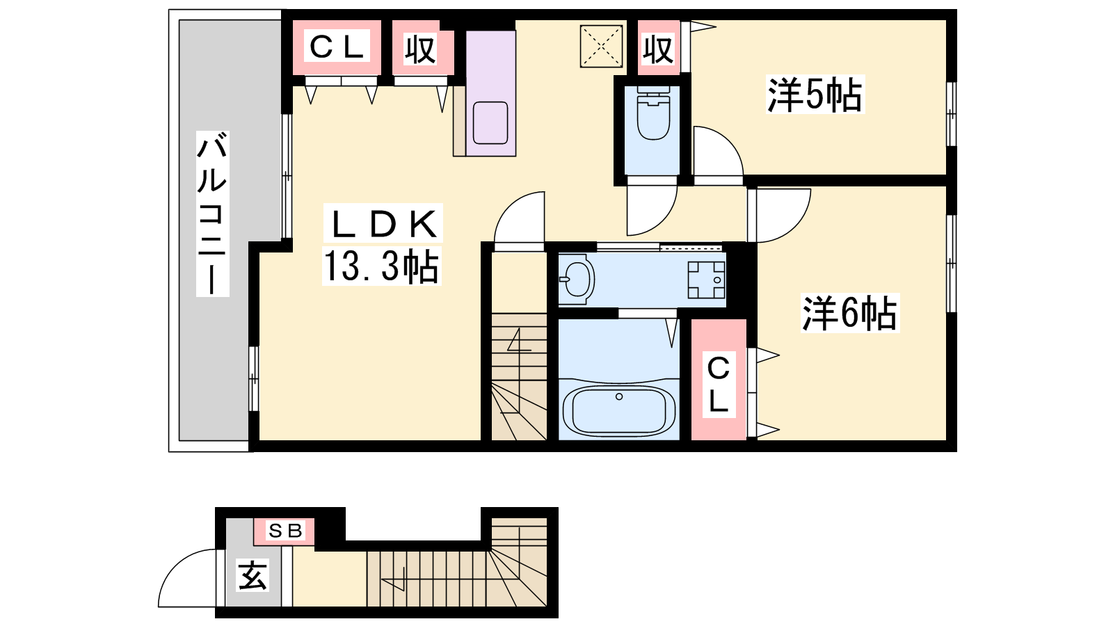 - LDK13.3帖、洋室5帖、洋室6帖