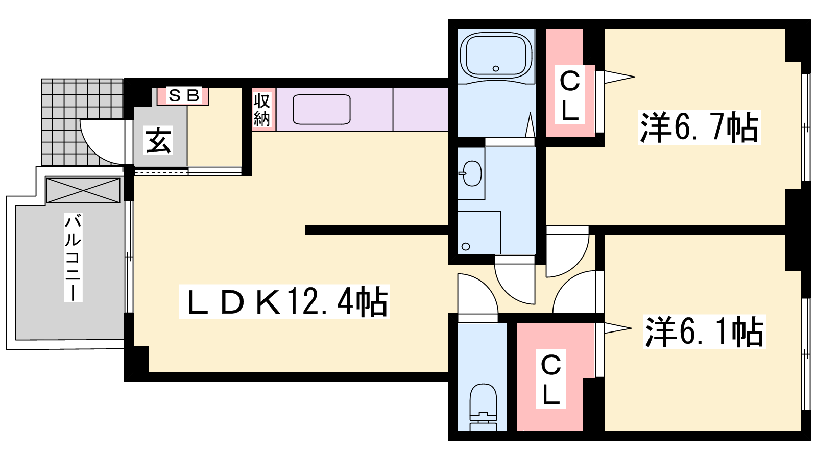 - LDK12.4帖、洋室6.5帖、洋室6.1帖