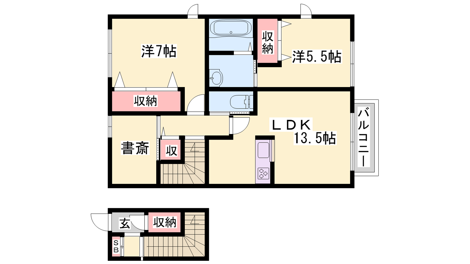- LDK13.5帖、洋室7帖、洋室5.5帖、S2.8帖