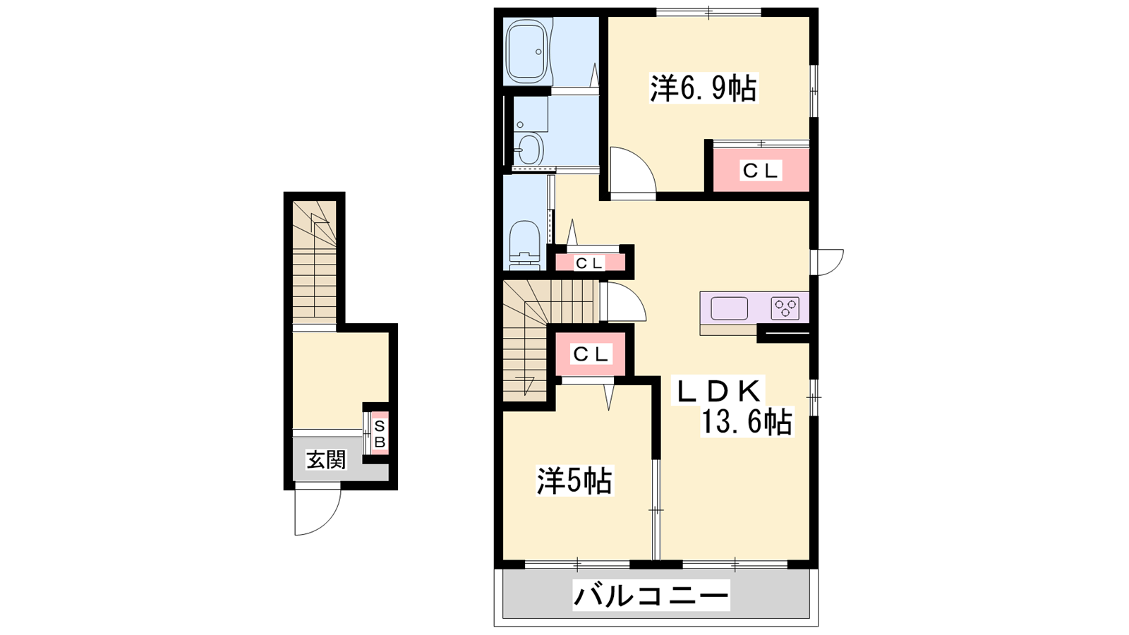 - LDK13.6帖、洋室6.9帖、洋室5帖