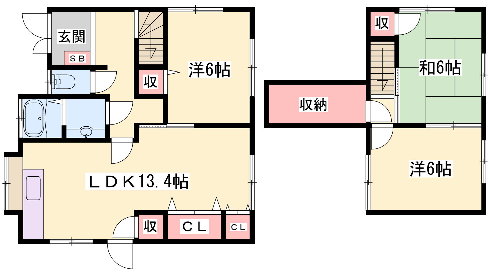 - LDK13.4帖、洋室6帖、洋室6帖、和室6帖
