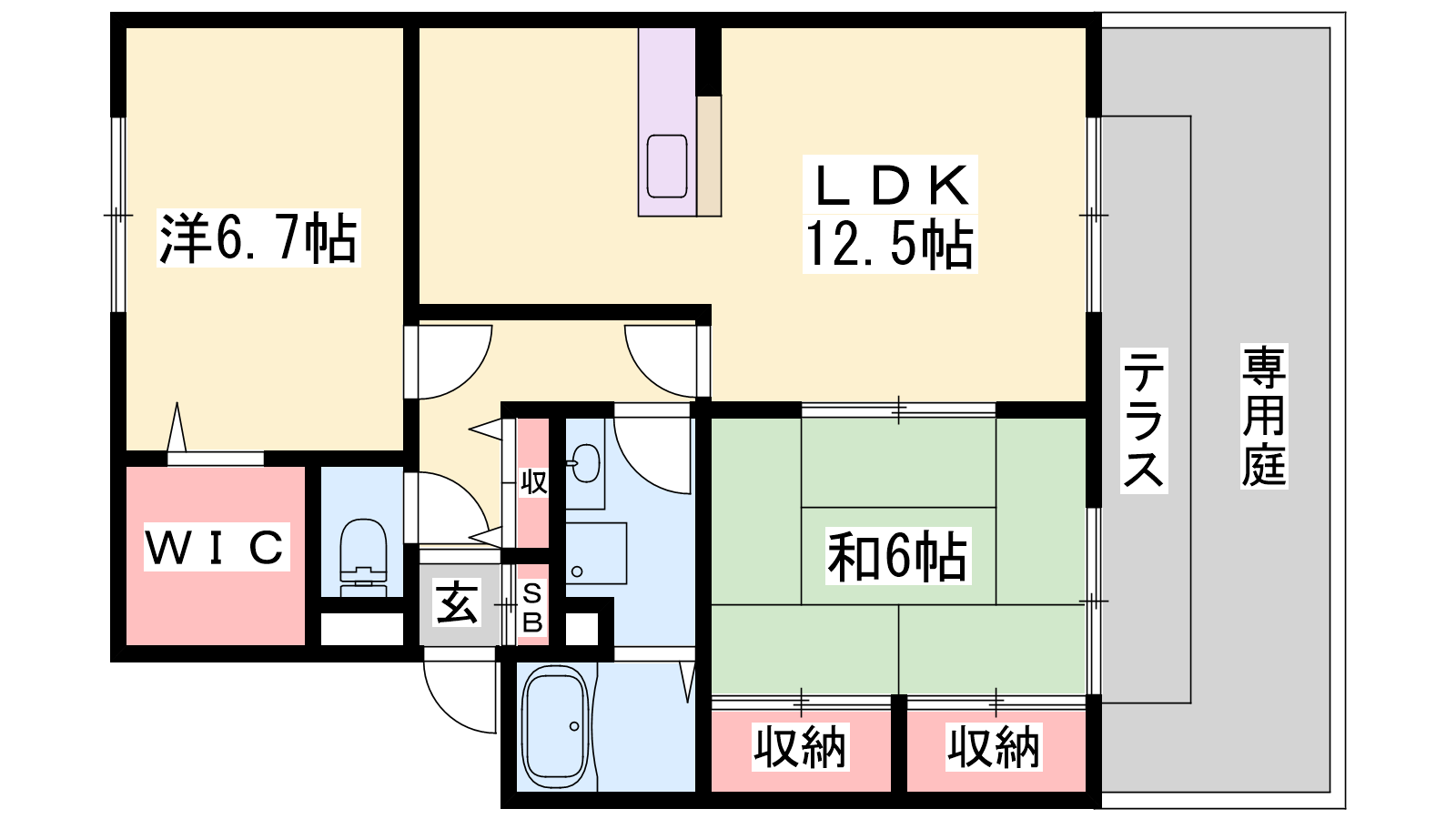 - LDK12.5帖、洋室6.7帖、和室6帖