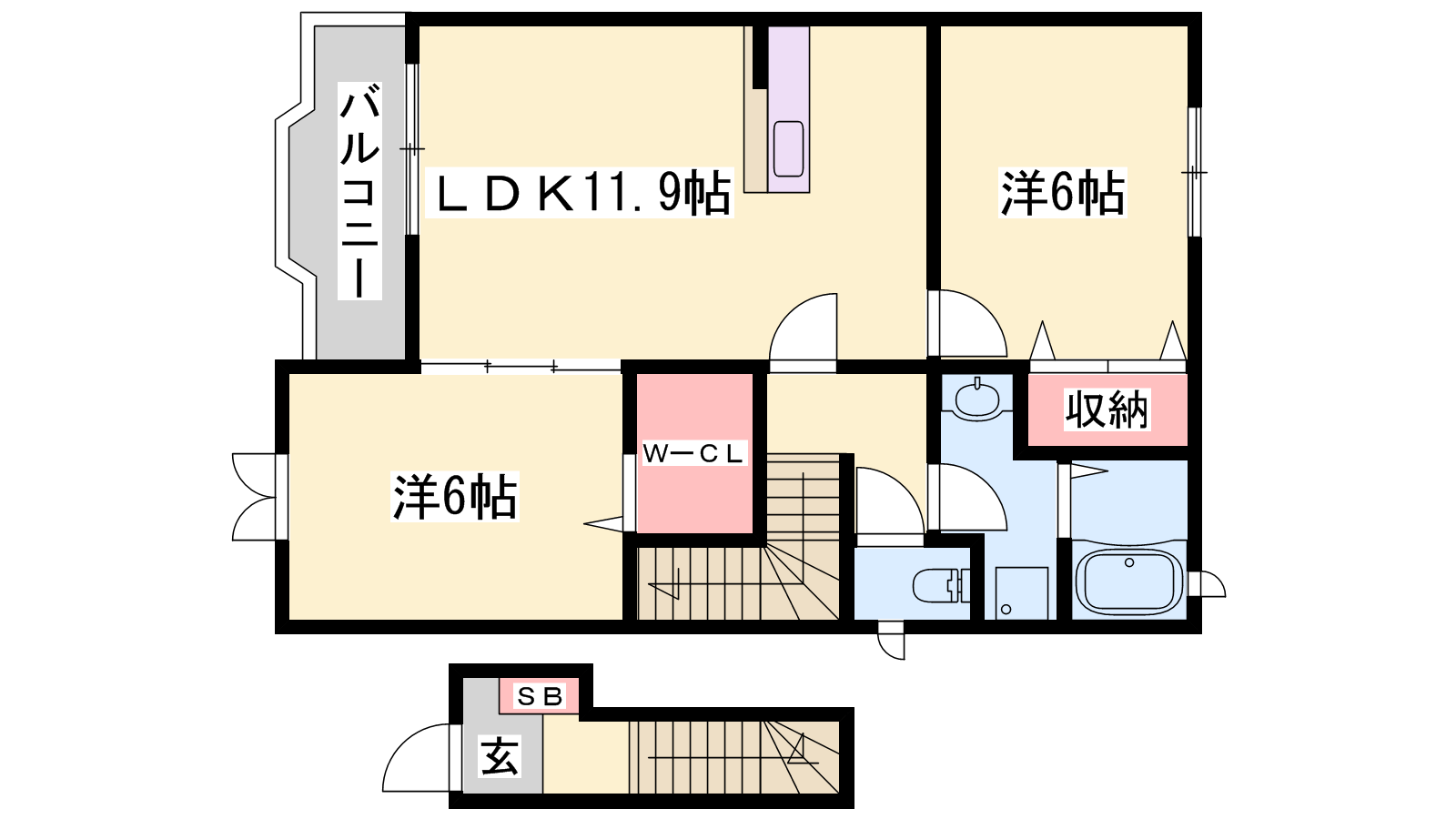 - LDK11.9帖、洋室6帖、洋室6帖
