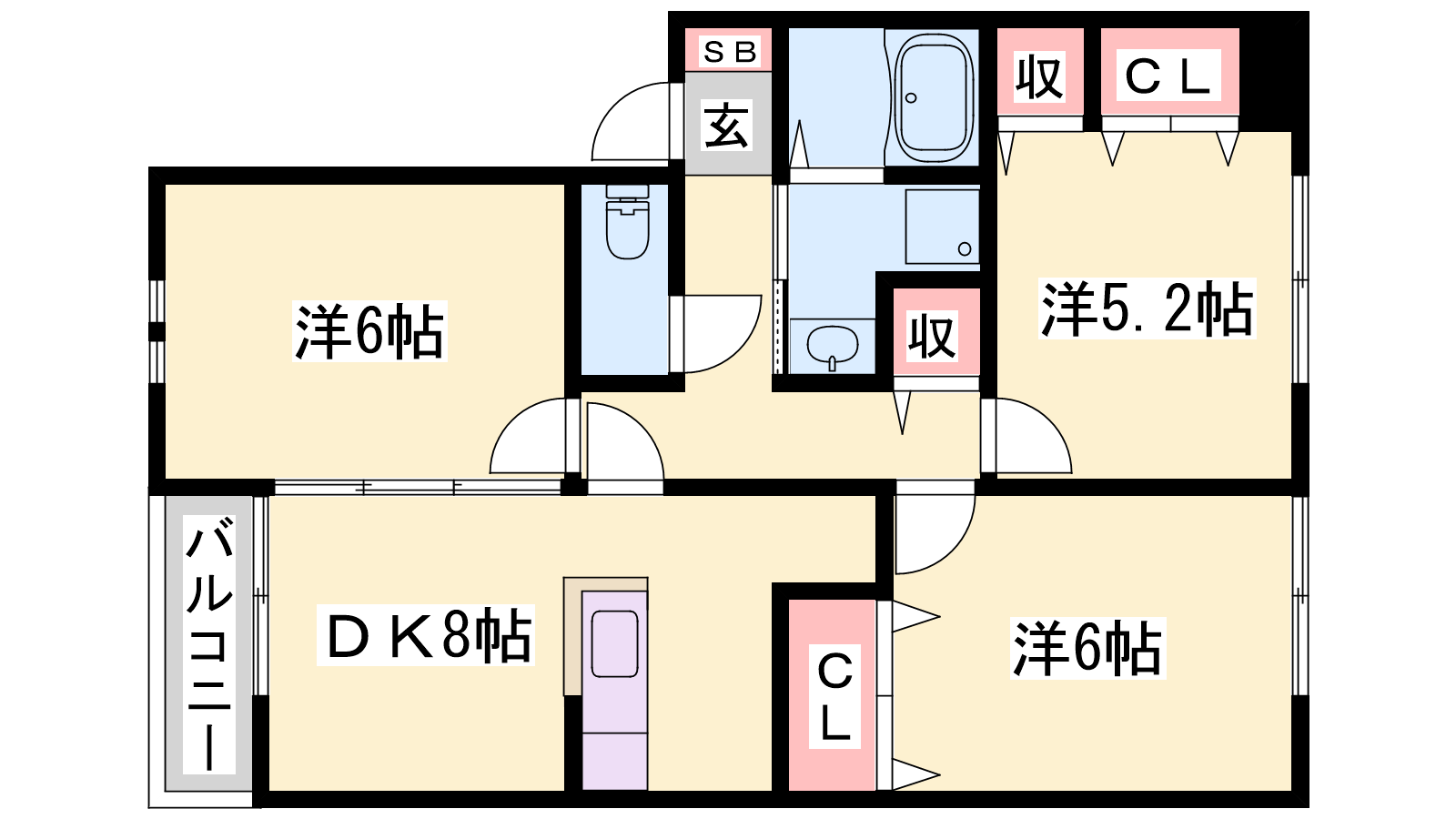 - DK8帖、洋室6帖、洋室6帖、洋室5.2帖