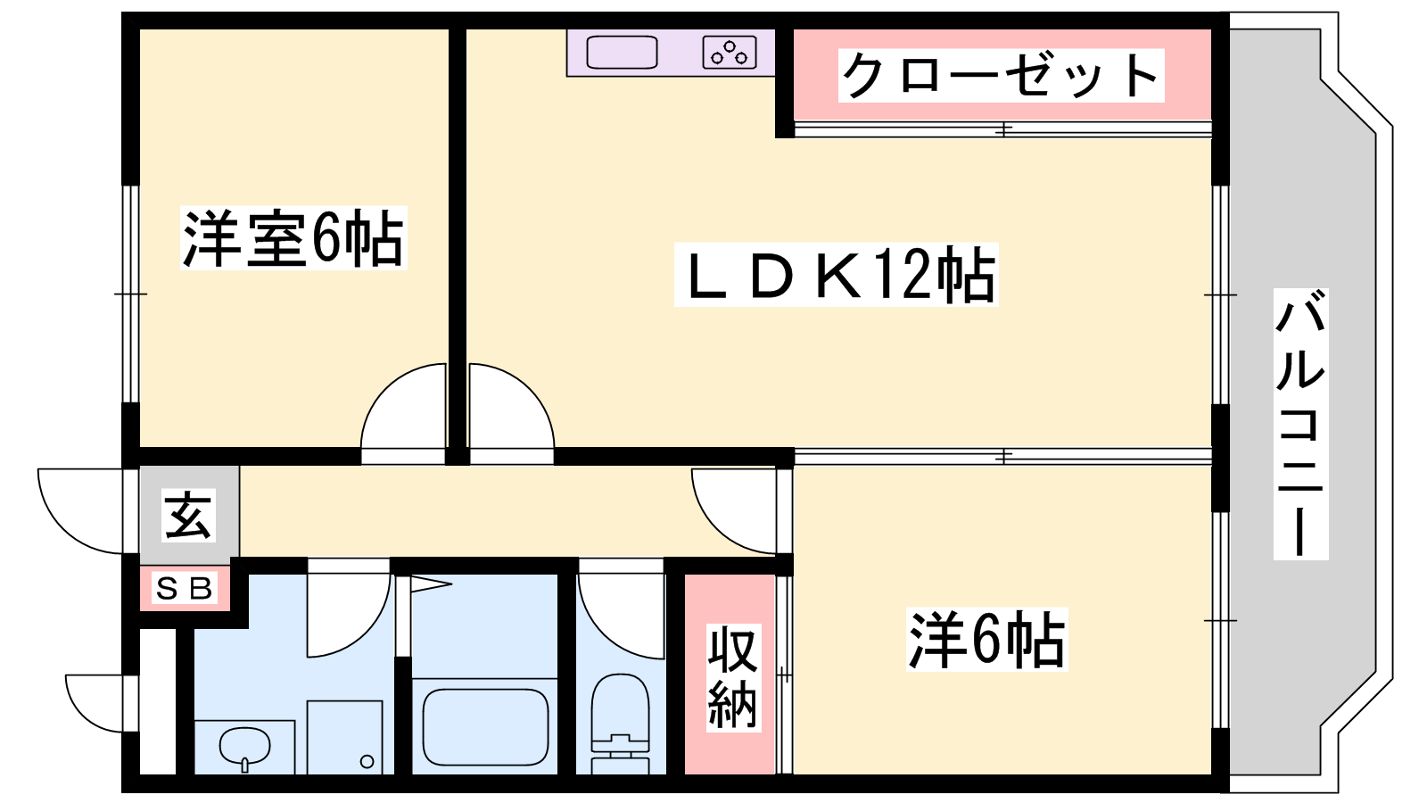 - LDK12帖、洋室6帖、洋室6帖