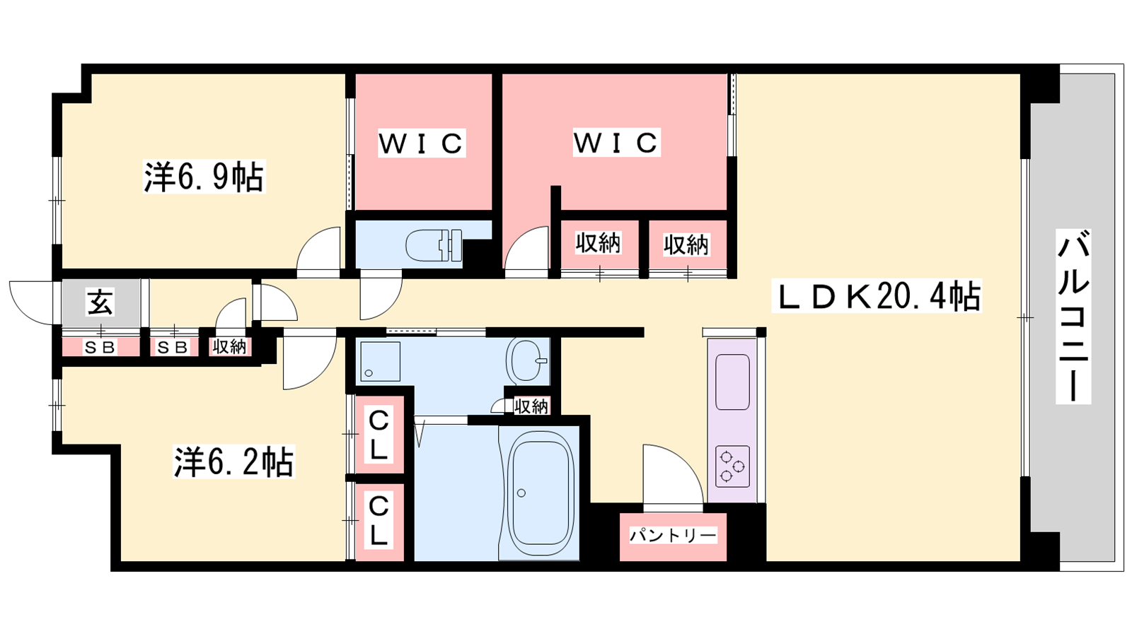 - LDK20.4帖、洋室6.9帖、洋室6.2帖
