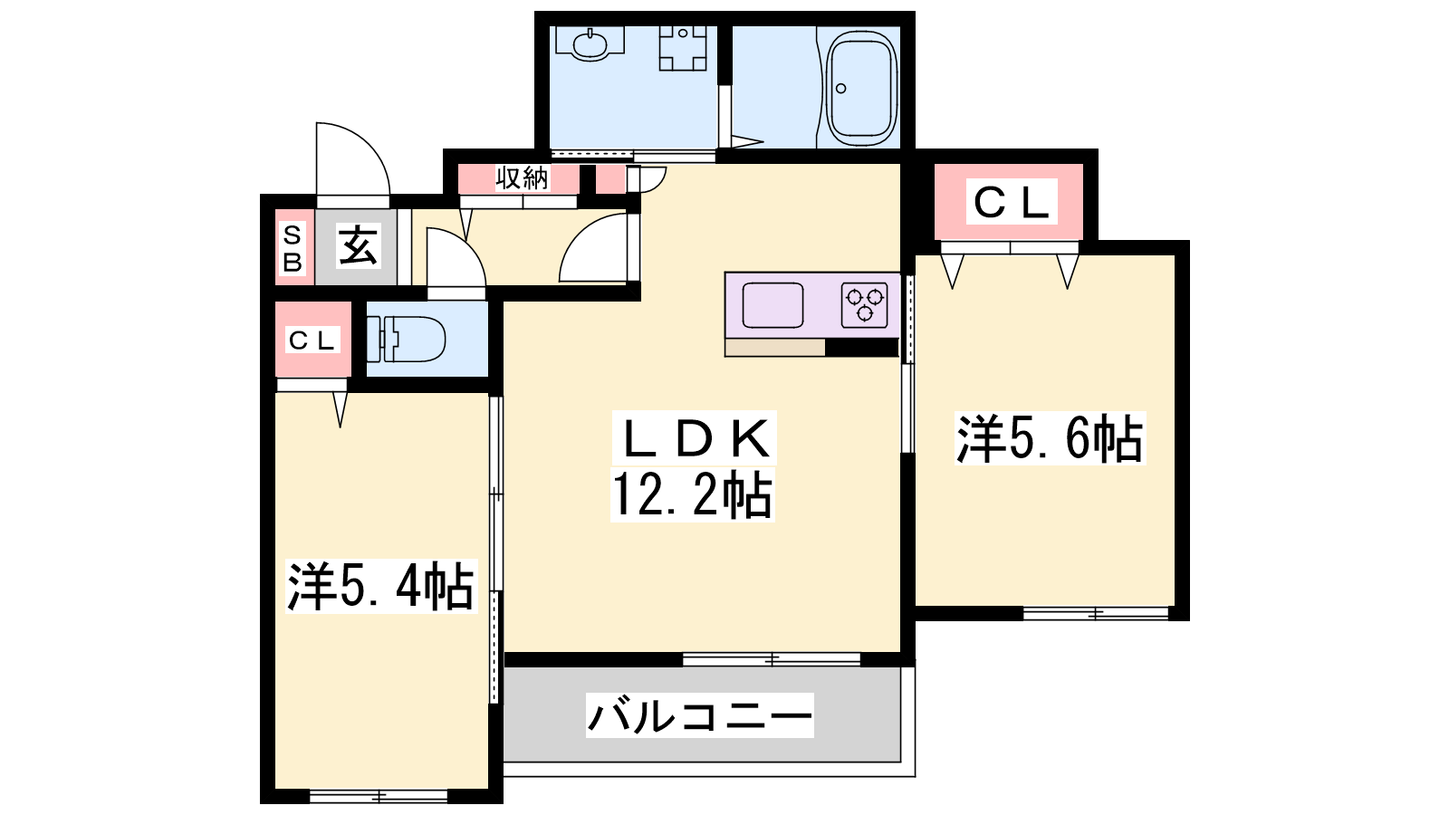 - LDK12.2帖、洋室5.6帖、洋室5.4帖